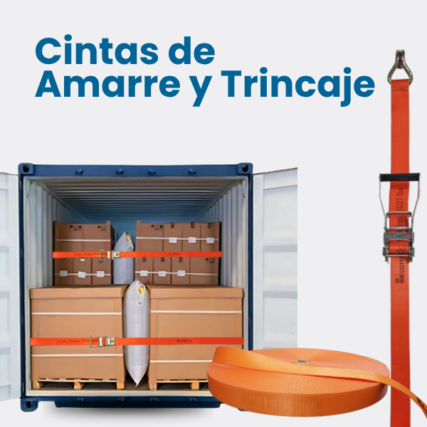 Las cintas de trincaje son la columna vertebral de la seguridad en transporte. Sirven para fijar la carga contra la superficie del camión, contenedor o vagón, evitando movimientos peligrosos durante el trayecto.